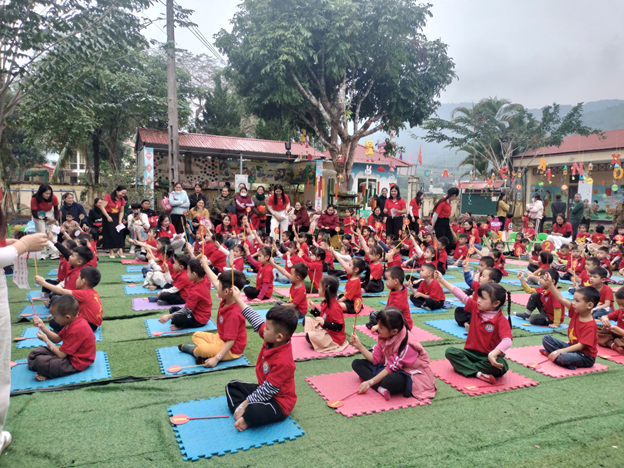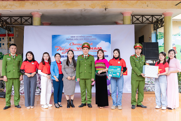 Trong chương trình, lực lượng Công an xã Đồng Lương cùng đội ngũ giáo viên nhà trường đã trực tiếp tham gia hướng dẫn, tuyên truyền và đồng hành cùng các bé trong từng hoạt động. Chương trình diễn ra sôi nổi với nhiều nội dung phong phú, phù hợp với từng độ tuổi. Mở đầu là màn đồng diễn bài “Việt Nam ơi” của toàn thể trẻ mẫu giáo trong trường, tạo không khí vui tươi, hào hứng.