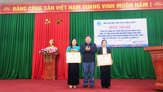 Tại hội nghị Hội LHPN xã Đồng Lương đã khen thưởng cho 2 tập thể tổ truyền thông công đồng thôn và 4 cá nhân đã đạt thành tích xuất sắc trong tổ chức triển khai thực hiện "Dự án 8" thực hiện bình đẳng giới và giải quyết những vấn đề cấp thiết đối với phụ nữ và trẻ em năm 2025.