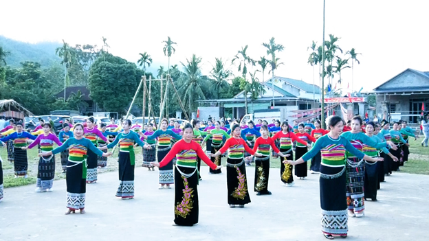 Điểm nhấn của phần hội là màn đồng diễn và các tiết mục văn nghệ đặc sắc do chính người dân địa phương biểu diễn. Những điệu xòe mềm mại, uyển chuyển của đồng bào Thái, tiếng cồng chiêng trầm hùng của đồng bào Mường vang lên giữa không gian núi rừng như kết nối trời đất và lòng người. Mỗi động tác, mỗi nhịp bước đều thể hiện niềm tự hào về bản sắc văn hóa và sự gắn bó keo sơn của cộng đồng nơi đây. Sự hồn hậu, mộc mạc trong tiếng hát, điệu múa không chỉ mang tính biểu diễn mà còn là sự gửi gắm tình cảm, niềm tin và khát vọng về cuộc sống no ấm, đoàn kết.