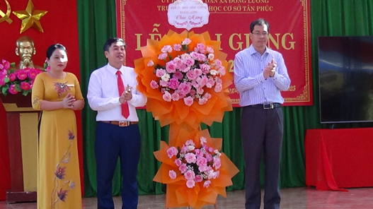Đồng chí Nguyễn Xuân Hạnh – Phó Bí thư Đảng ủy, Chủ tịch UBND xã tặng hoa chúc mừng trường THCS Tân Phúc.