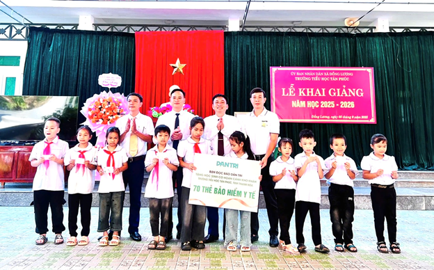 Đồng chí Hà Văn Bằng – Ủy viên Ban Thường vụ Đảng ủy, Phó Chủ tịch UBND xã cùng đại diện báo Dân Trí trao 70 thẻ BHYT cho học sinh và 2 xuất học bổng cho học sinh khó khăn trị giá mỗi xuất 5 triệu đồng