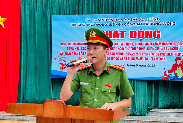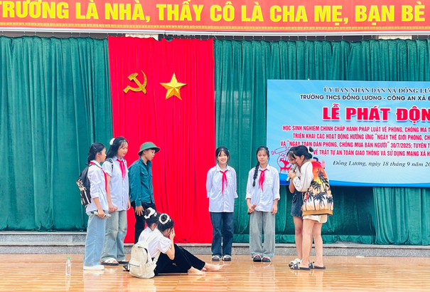 Chiều 18/9, Trường THCS Đồng Lương tổ chức Lễ phát động hoạt động ngoại khóa phòng, chống ma túy, buôn bán người và tuyên truyền pháp luật năm học 2025–2026. Chương trình nhằm hưởng ứng Ngày Thế giới phòng chống mua bán người và Ngày toàn dân phòng chống mua bán người, đồng thời nâng cao nhận thức về trật tự an toàn giao thông và sử dụng mạng xã hội an toàn trong học sinh. Tham dự buổi Lễ có đồng chí Bùi Huy Hoàng -Ủy viên BTV Đảng ủy, Trưởng Công an xã Đồng Lương, cán bộ chiến sĩ Công an xã, Hội Cha mẹ học sinh, Ban Giám hiệu nhà trường, cùng toàn thể cán bộ, giáo viên và học sinh các khối lớp.