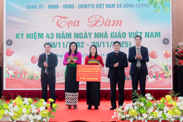 Nhân dịp này, lãnh đạo Đảng ủy, HĐND, UBND và Ủy ban MTTQ xã đã tặng hoa chúc mừng Trung tâm Chính trị xã và 6 trường học trên địa bàn; đồng thời trao tiền hỗ trợ cho gia đình cô giáo Phạm Thị Phúc (Trường Tiểu học Đồng Lương) bị thiệt hại nhà ở trong cơn bão số 10, thể hiện tinh thần sẻ chia và sự chăm lo thiết thực của chính quyền đối với đội ngũ nhà giáo.